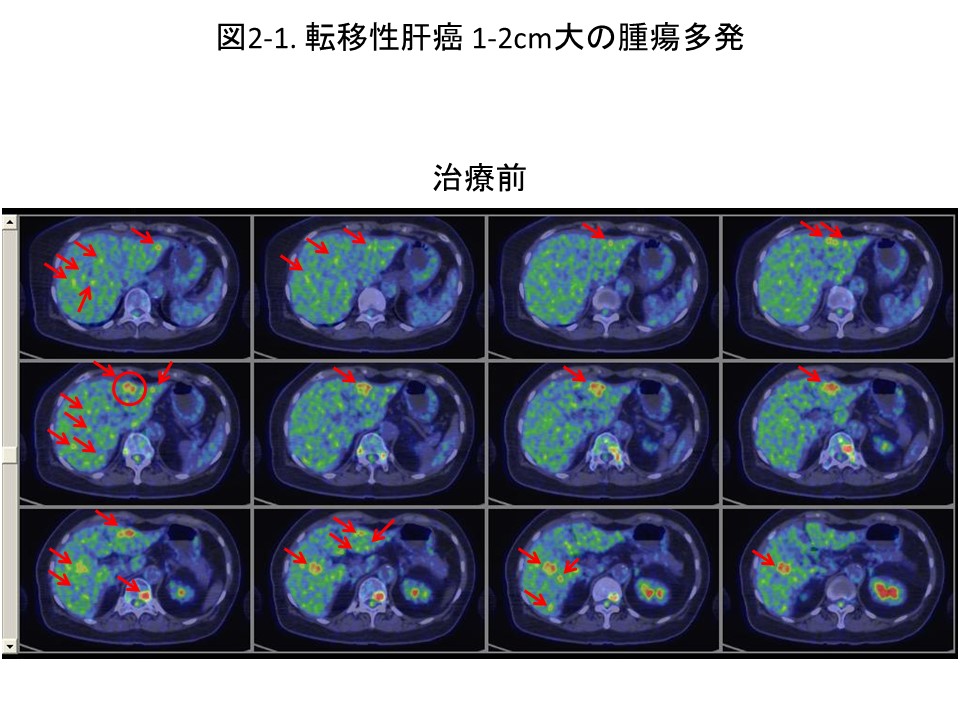 転移性肝癌とは、肝臓以外の臓器にできた癌(原発巣)が肝臓に転移したものを指します。ほぼすべての癌種において、肝臓へ転移する可能性がありますが、実際には消化器系の癌(大腸がん、胃がん、膵がん、胆のうがんなど、)乳癌、肺癌、婦人科系の癌、腎癌などが肝臓への転移を認めることが多いと報告されています。当院ではそのような転移性肝癌についても、積極的に無痛RFAを行っています。転移性肝癌は肝硬変を合併していないため、より大きな、そして、たくさんの腫瘍を焼灼することが可能です(図1-2)。しかし、転移性肝癌に対する無痛RFAはまだ歴史が浅く、外科的手術、抗がん剤治療、無痛RFAのいずれが最良なのか結論がでておりません。転移性肝癌の治療に関しては、無痛RFAのみに固執せず、必要とあれば、抗がん剤治療、放射線治療等をうまく組み合わせて、患者さんがより元気に長生きできるよう努めております。肝内の腫瘍量減退が予後延長に結びつくと予想される場合は、積極的に集学的治療の一環として、無痛RFAをおこなっています。 (全身状態に実施不可能な場合もあります。)そのため、明確な腫瘍の大きさ、腫瘍の個数の制限を設けていません。お手数ですが、ご自身の転移性肝癌の状態が無痛RFAの適応かどうか、個別に外来に受診していただきご相談いただければ幸いです。大まかな目安としては、最大径5cmの場合は3個程度まで、最大径2cmの場合は10個程度までとなります。